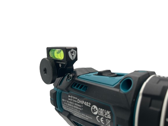 Die Wasserwaage wird einfach am Makita Akkuschrauber angebracht und lässt sich flexibel justieren, um in jeder Lage präzise auszurichten.